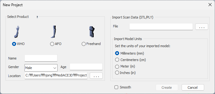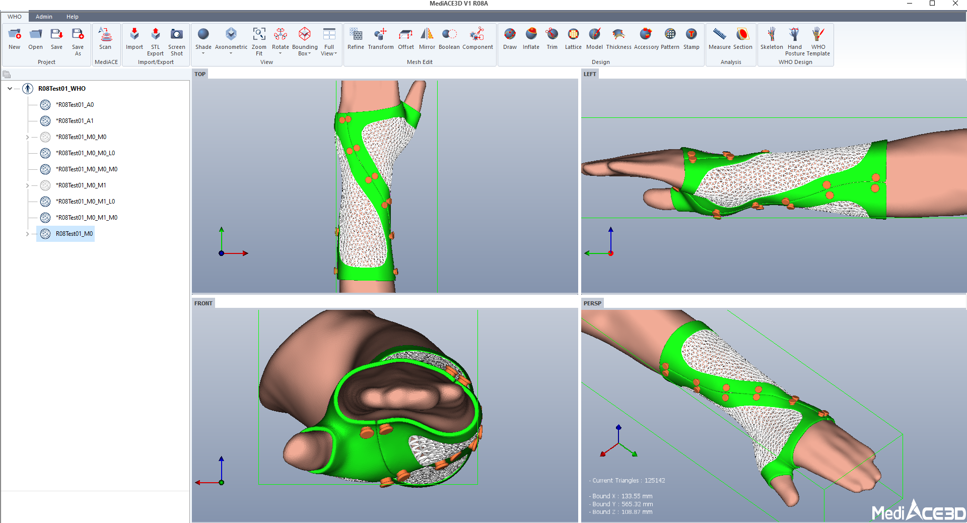 When defining an WHO project and importing a hand scan file, the Toolbar menu for the WHO design is activated.
