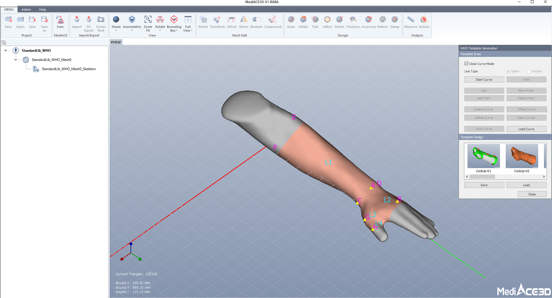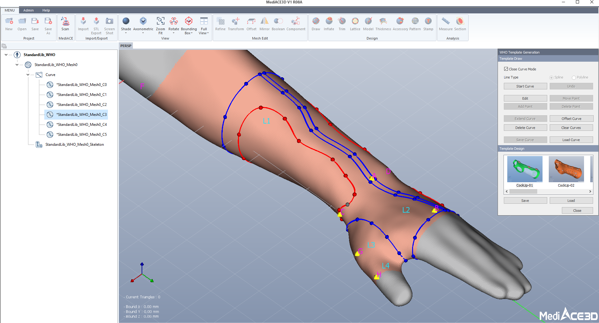 The hand model, defined as a standard library containing skeleton information, is loaded, and the design draw function is used to create a design curve and register the template design.
